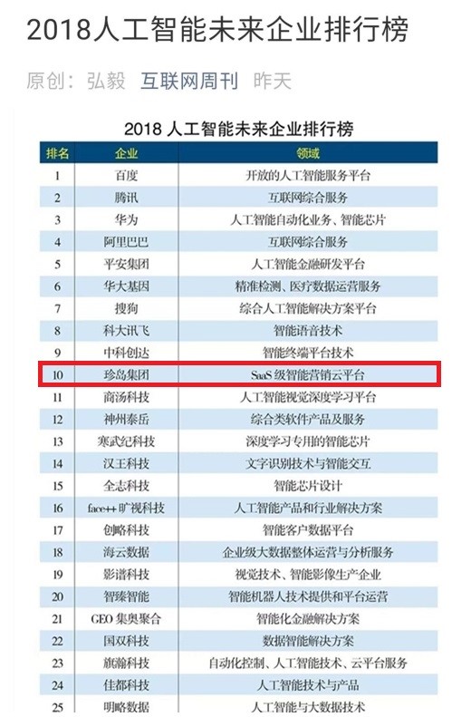 查看詳情9月29日,由中國科學(xué)院《互聯(lián)網(wǎng)周刊》與eNet研究院聯(lián)合發(fā)布了“2018人工智能未來企業(yè)排行榜”。珍島集團(tuán)作為SaaS智能營銷云平臺領(lǐng)域的獨(dú)角獸企業(yè),位列排行榜前10,再次彰顯了珍島深厚的技術(shù)實(shí)力與創(chuàng)新能力。