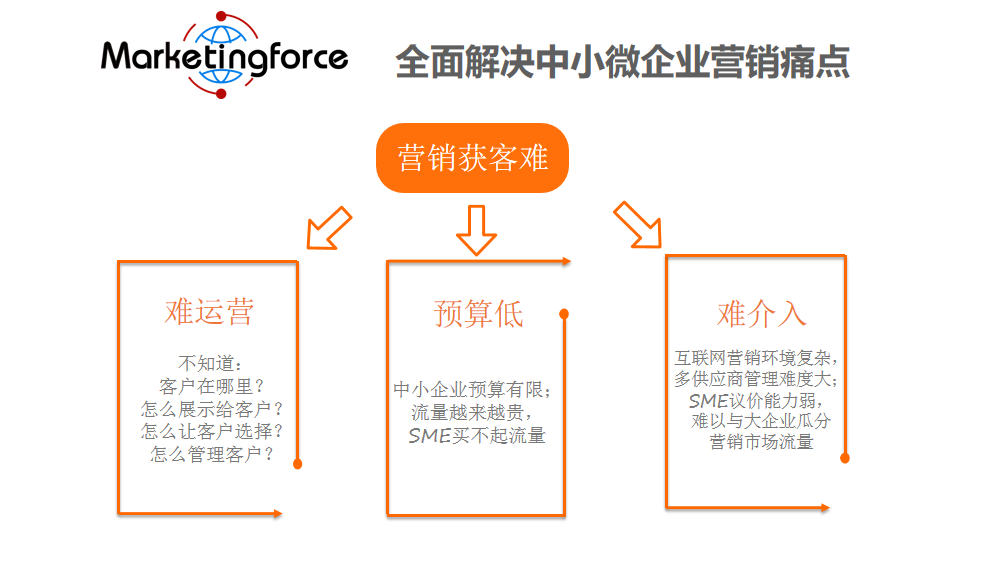 隨著全球經(jīng)濟(jì)一體化及商業(yè)趨勢(shì)的持續(xù)演進(jìn),促使?fàn)I銷模式在全球范圍內(nèi)快速升級(jí)與迭代。當(dāng)大多數(shù)企業(yè)服務(wù)平臺(tái)都聚焦在如何幫助發(fā)展中的中小企業(yè)提升管理效能和優(yōu)化流程的時(shí)候,珍島則更加關(guān)心“企業(yè)的生存壓力和營(yíng)銷困境”。縱觀國(guó)內(nèi)營(yíng)銷市場(chǎng),中小微企業(yè)在數(shù)字營(yíng)銷領(lǐng)域仍存在普適性痛點(diǎn)。這主要體現(xiàn)在三個(gè)方面,首先是難介入,互聯(lián)網(wǎng)營(yíng)銷環(huán)境復(fù)雜,多供應(yīng)商管理難度大,議價(jià)能力弱,難以與大企業(yè)瓜分營(yíng)銷市場(chǎng)流量;其次是預(yù)算低,中小企業(yè)預(yù)算有限,而流量越來(lái)越貴;最后是難運(yùn)營(yíng),專業(yè)人力缺失、資源獲取困難、無(wú)法數(shù)據(jù)透視、技術(shù)工具缺失等問(wèn)題也都是阻礙。