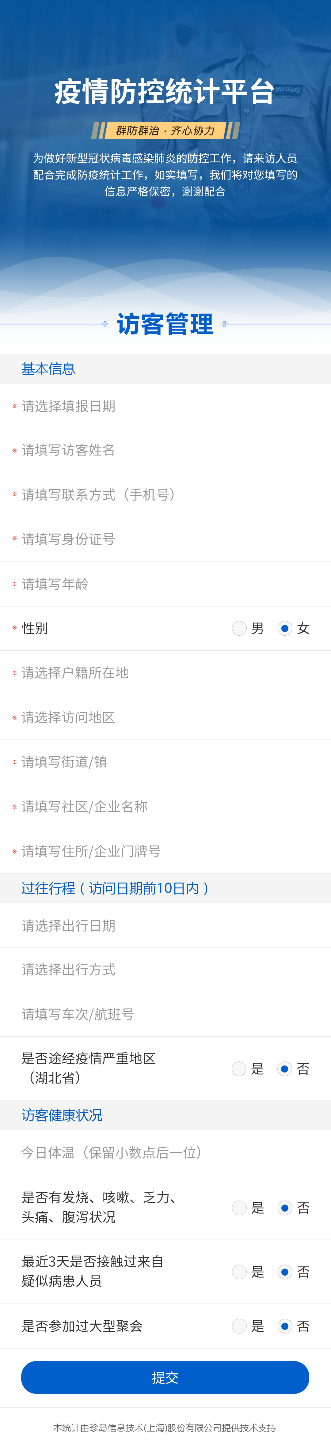 通過“珍島防疫跟蹤系統(tǒng)”,可以高效信息化手段對(duì)企業(yè)員工、來訪客戶(企業(yè)/園區(qū))、學(xué)校師生等進(jìn)行近期健康情況跟蹤,通過在線提交健康信息與統(tǒng)計(jì),實(shí)時(shí)上報(bào)人員健康情況,后臺(tái)健康統(tǒng)計(jì)與管理,及時(shí)掌握人員信息健康動(dòng)態(tài),在確保數(shù)據(jù)安全、高效流通的同時(shí),降低人員感染風(fēng)險(xiǎn),以便針對(duì)異常情況及時(shí)做出應(yīng)對(duì)與處理,全面、有效助力抗擊疫情!