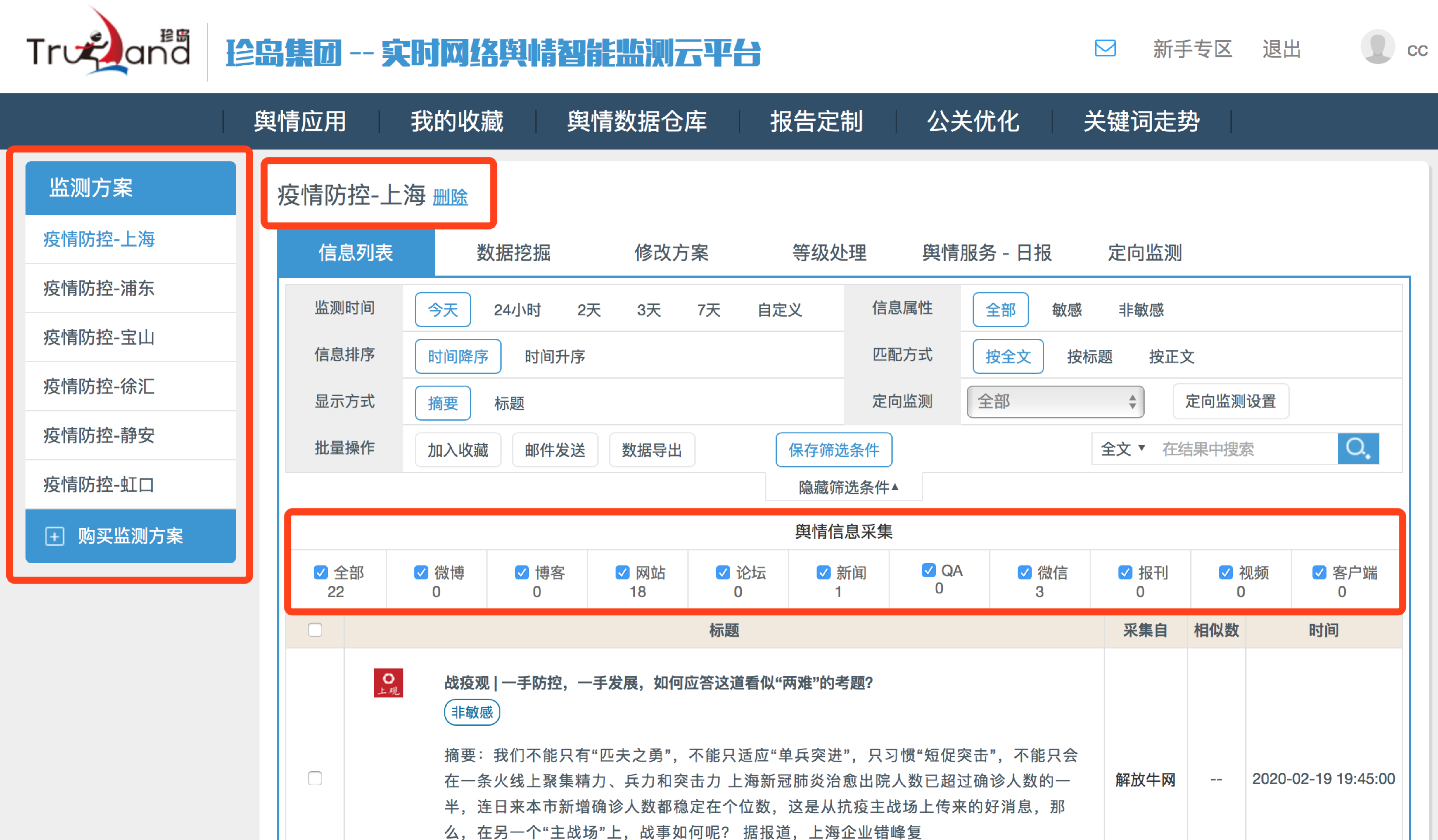 為更好的配合、協(xié)助防疫期間各級部門的工作需要,在疫情防控新技術(shù)、新系統(tǒng)應(yīng)用領(lǐng)域,珍島堅持快速部署,快速服務(wù)的原則,迅速完成實時網(wǎng)絡(luò)輿情智能監(jiān)測云平臺的升級工作,面向全國各級需求部門落地服務(wù)供應(yīng)。
