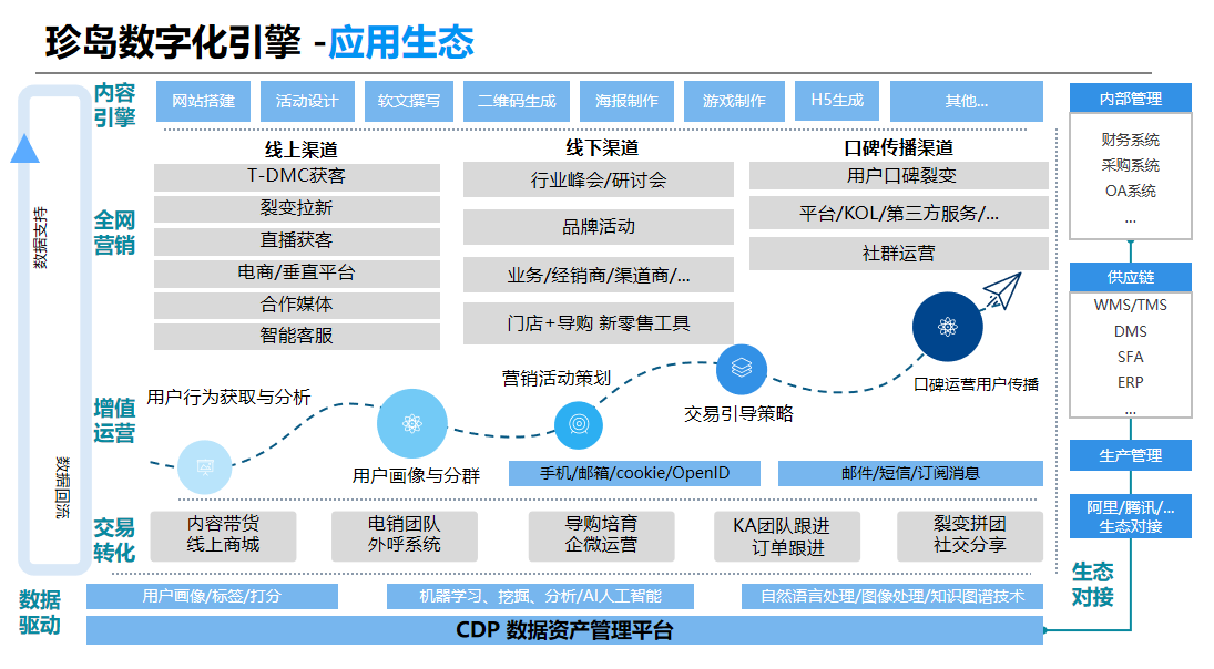 張蓬在演講中談到珍島在企業(yè)數(shù)字化運(yùn)營(yíng)增值賦能方面所做出的探索。珍島Marketingforce作為全球領(lǐng)先的SaaS智能營(yíng)銷(xiāo)云平臺(tái),面向企業(yè)提供了一個(gè)“智能化、數(shù)字化、工具化”的全網(wǎng)營(yíng)銷(xiāo)環(huán)境。營(yíng)銷(xiāo)獲客是企業(yè)數(shù)字化運(yùn)營(yíng)賦能過(guò)程的首要問(wèn)題,直接影響企業(yè)高質(zhì)量生存與發(fā)展,為此珍島在國(guó)內(nèi)首創(chuàng)了Marketingforce企業(yè)營(yíng)銷(xiāo)力賦能平臺(tái),涵蓋完整的IaaS、PaaS、SaaS三層架構(gòu),以及數(shù)字威客、云應(yīng)用市場(chǎng)、數(shù)字媒體自助等開(kāi)放子平臺(tái),集成全球數(shù)字營(yíng)銷(xiāo)工具與資源,構(gòu)建全球、全網(wǎng)、全場(chǎng)景化的“一站式智能營(yíng)銷(xiāo)工作環(huán)境”,融合“跨平臺(tái)數(shù)據(jù)整合、知識(shí)圖譜、智能內(nèi)容生成、智慧發(fā)布、營(yíng)銷(xiāo)數(shù)據(jù)透視”等核心AI技術(shù)。生態(tài)化柔性平臺(tái)架構(gòu)設(shè)計(jì)標(biāo)準(zhǔn),讓“All