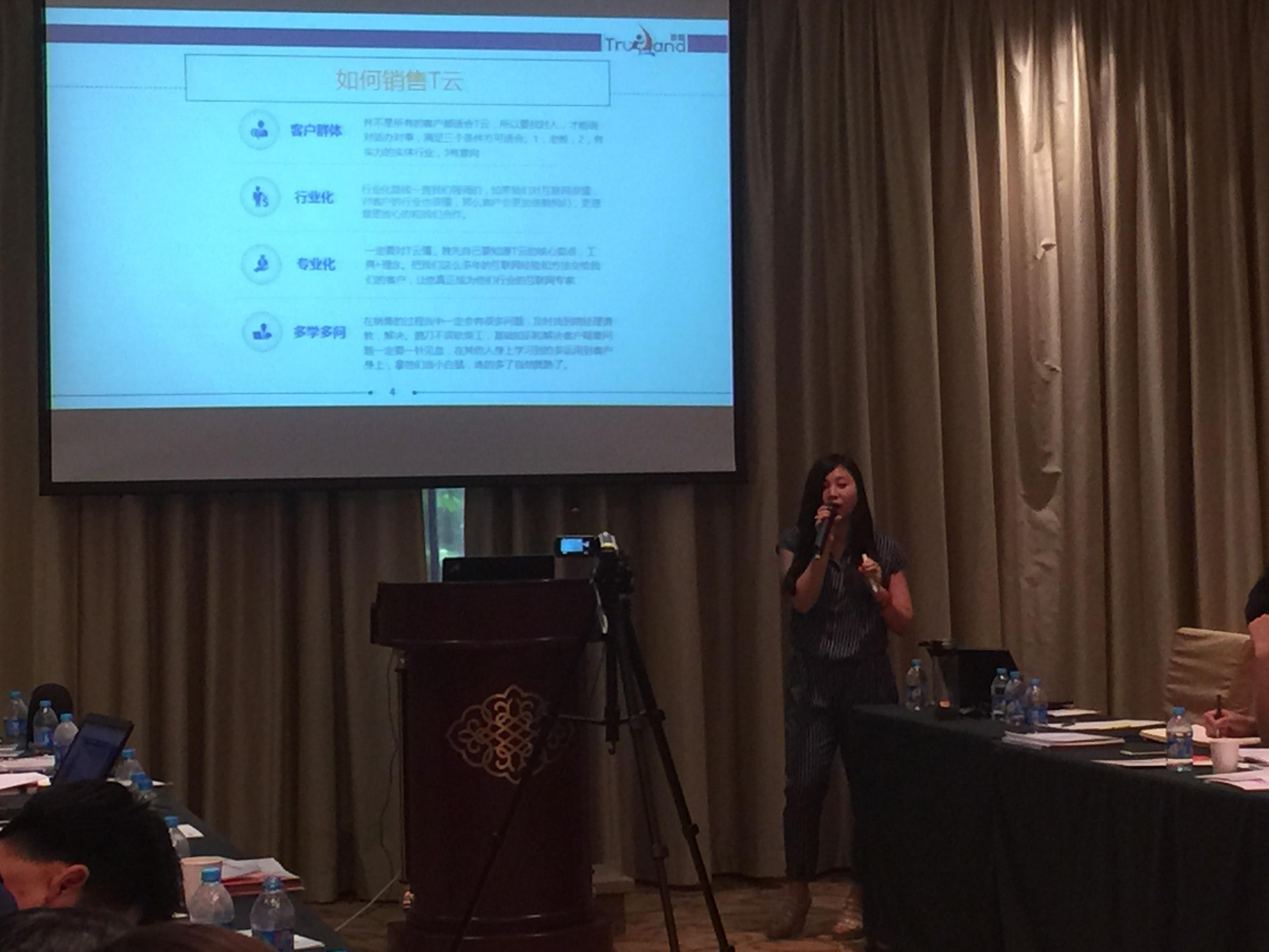 珍島中小體系一營四部商務(wù)經(jīng)理Sam和銷售主管Sophia在活動現(xiàn)場也做了T-Cloud實際銷售操作的分享。Sophia介紹了她是如何轉(zhuǎn)變思路,從賣網(wǎng)站轉(zhuǎn)變?yōu)橘uT-Cloud。一開始她并不能接受,感覺這套產(chǎn)品到處都是問題,到后來發(fā)現(xiàn)T-Cloud的真實魅力,真正熱愛上了T-Cloud,并且把T-Cloud賣得相當(dāng)出色。接著她又著重分析了T-Cloud的客戶群體,行業(yè)化和專業(yè)化的重要性。尤其她談到T-Cloud在對新員工的出單幫助上,她認(rèn)為T云的簡單模式讓對互聯(lián)網(wǎng)了解沒有那么深入的新員工也能夠輕松的約上客戶,每月保證穩(wěn)定的業(yè)績。