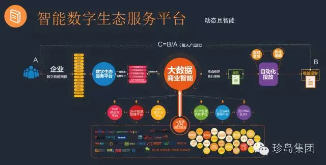 通過將所有資源進(jìn)行深度整合,珍島在業(yè)內(nèi)首先提出“數(shù)字生態(tài)服務(wù)平臺”的全新理念,結(jié)合云計算、大數(shù)據(jù)、人工智能等先進(jìn)技術(shù),打通國內(nèi)主流媒體及第三方平臺的數(shù)據(jù),并依托珍島集團(tuán)十多年來服務(wù)數(shù)萬家企業(yè)的行業(yè)數(shù)據(jù)沉淀,旨在為企業(yè)提供一站式、自動化數(shù)字營銷解決方案,開啟智能營銷的新征程。(如上圖所示)