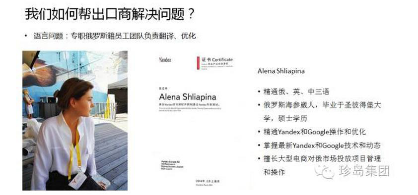 Yandex是俄羅斯市場占有率高的搜索引擎,被譽為進入俄羅斯互聯(lián)網(wǎng)的門戶,珍島是早從事Yandex推廣服務的中國互聯(lián)網(wǎng)企業(yè)之一,經(jīng)過2年多的努力,珍島已經(jīng)形成了由中俄專業(yè)人士共同組成的專業(yè)對俄推廣團隊,在今年六月在柏林召開的Yandex全球專家峰會上,珍島作為唯一的中國服務商代表受邀出席。