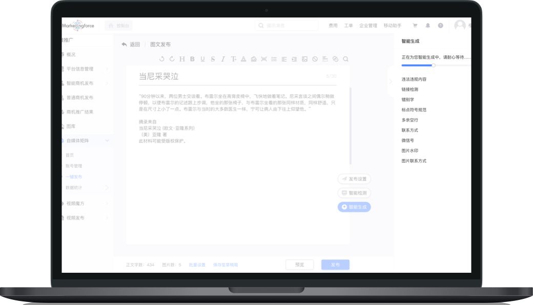 Build your enterprise's self-media marketing content library for seamless creation, efficient management, and distribution across major media platforms.